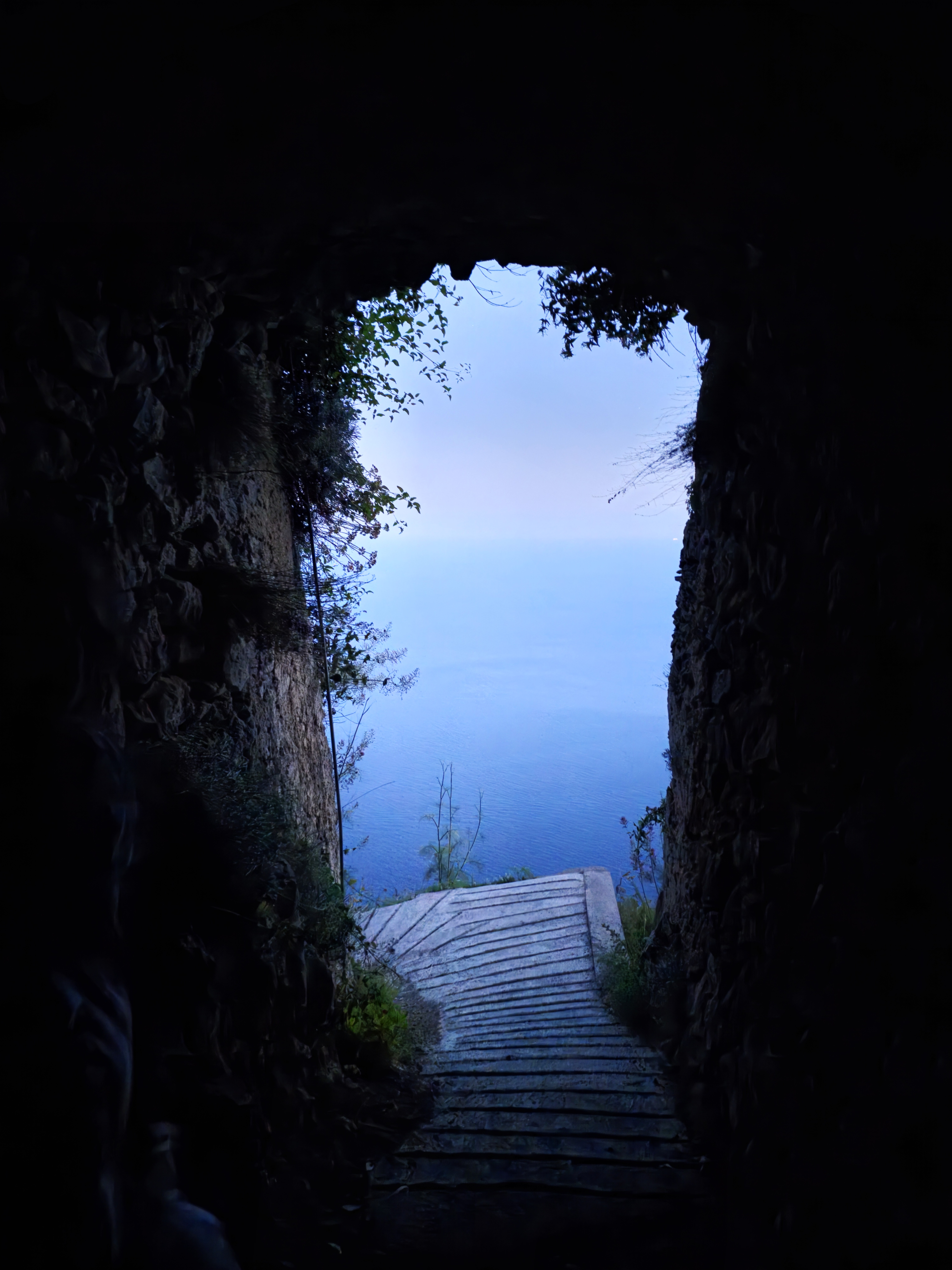 Wir schlichen auf leisen Sohlen durch den Tunnel. Hier waren in der Abwesenheit von neugierigen Fingern kleine Stalagmiten gewachsen. Es war eine Herausforderung ihnen auszuweichen. Der Weg führte leicht nach oben. Es war stockdunkel doch am Ende des Tunnels sah ich ein blaues Licht hereinfallen. Behutsam ging ich auf die Öffnung zu. Mit jedem Schritt wurde sie größer.